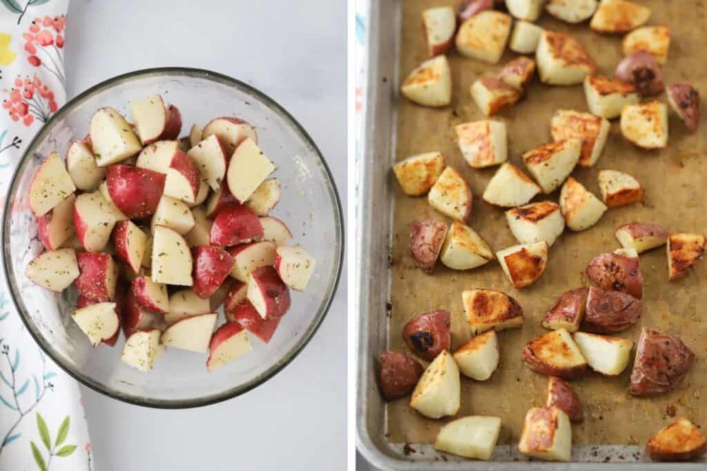 - Roast. Spread the potatoes onto the baking sheet and cook for about 20 minutes at 425 degrees F, or until the potatoes are golden brown.